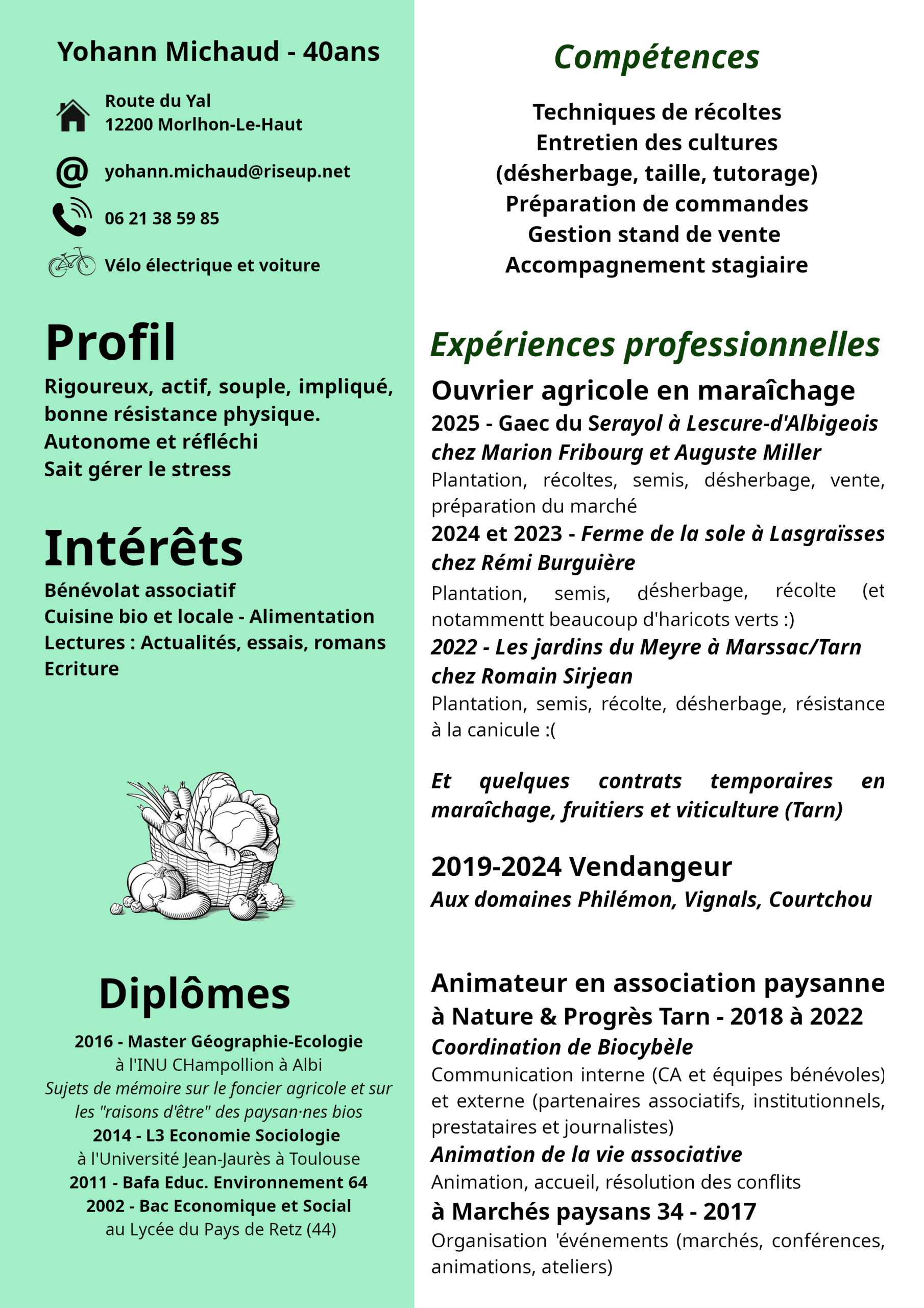 J’ai fait 4 saisons en maraîchage bio dans le Tarn de mars à octobre à 20-30h par semaine (récolte, entretien des cultures, vente). Avant cela, je travaillais plutôt pour des associations paysannes, dans l’Hérault et dans le Tarn (animation et secrétariat). Voir CV ci-joint.